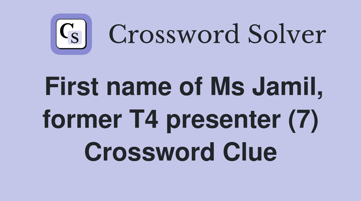 First name of Ms Jamil former T4 presenter (7) Crossword Clue