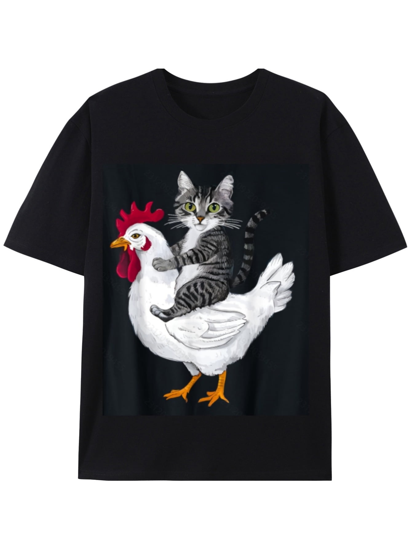 Fun Cat and Chicken Riding Short sleeved T shirt Gray Cat Calmly