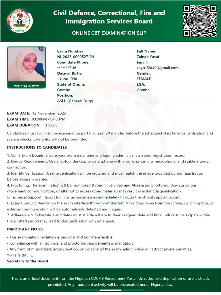 ZAINAB YUSUF Application Slip PDF