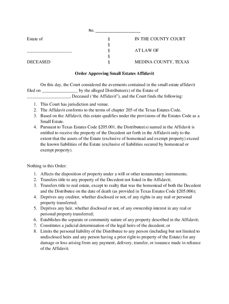 Fillable Online Small Estates Affidavit Order Medina County Texas