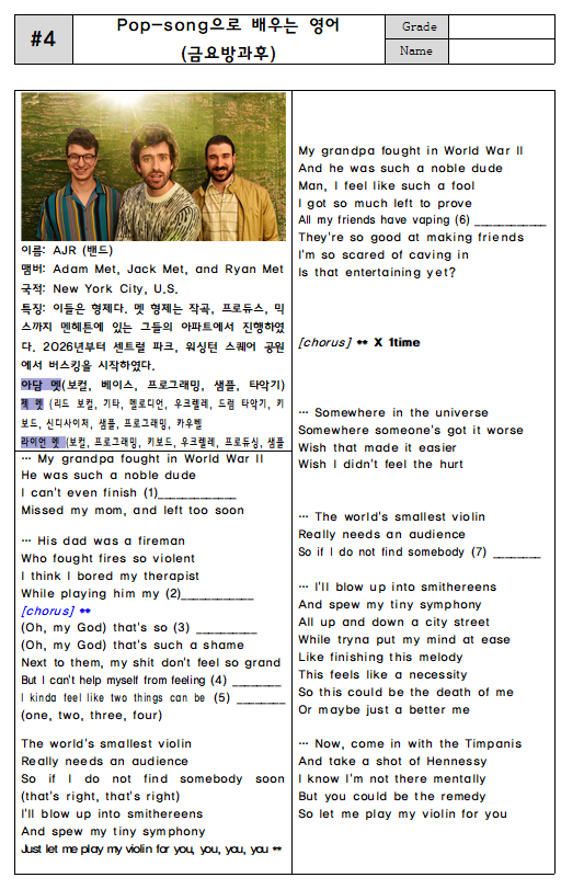 팝송활동지 World Smallest Violin AJR (Dictation / Crossword / 한글 발음 활동지