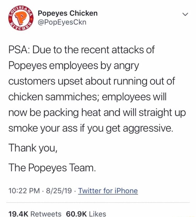 PSA: Due to the recent attacks of Popeyes employees by angry customers