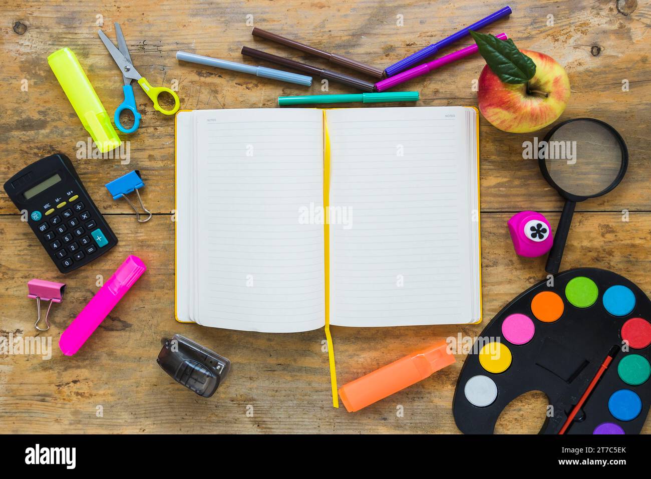 Writing implements laid circle with jotter middle Stock Photo Alamy