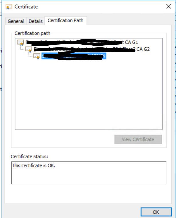 Certification Path in Certificates Snap in of mmc ok but in IIS