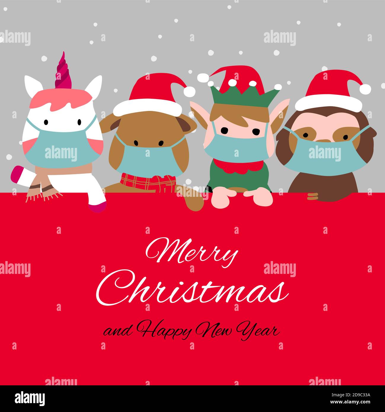 Snowman penguin and santa cluas are happy emotion and wear masks with