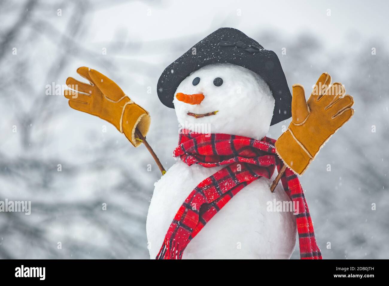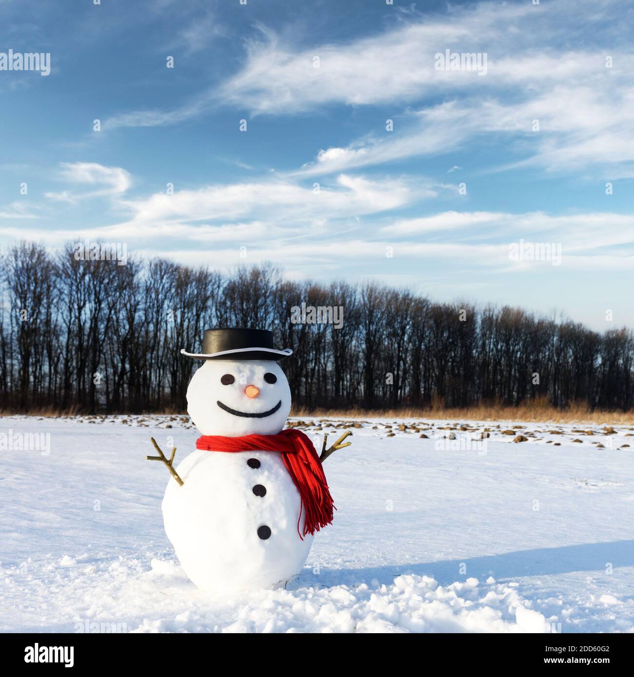 Funny snowman in stylish black hat and red scalf on snowy field Merry
