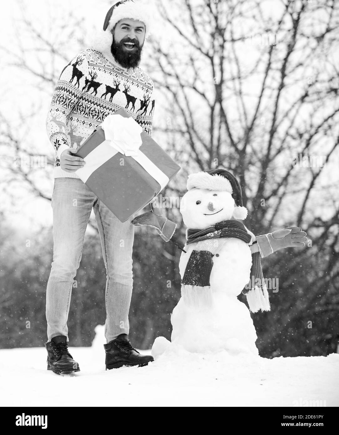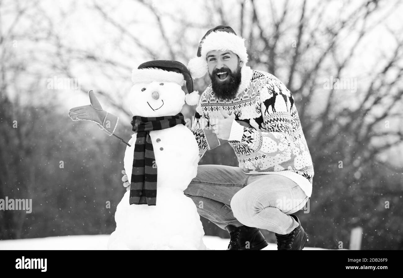 Winter vacation Man made snowman Hipster with beard outdoors Man