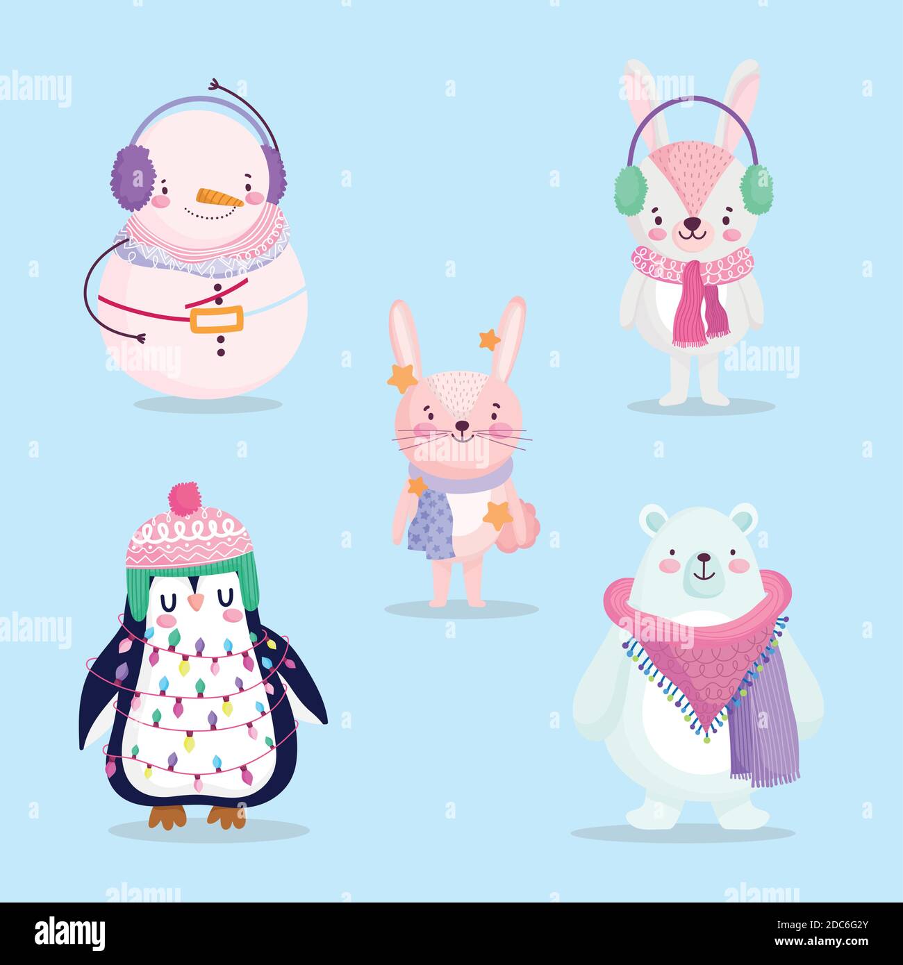 merry christmas cute bear penguin snowman and rabbit with hat and