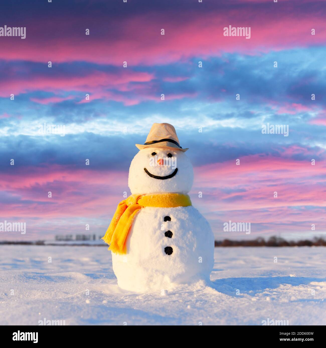 Funny snowman in stylish hat and yellow scalf on snowy field Merry