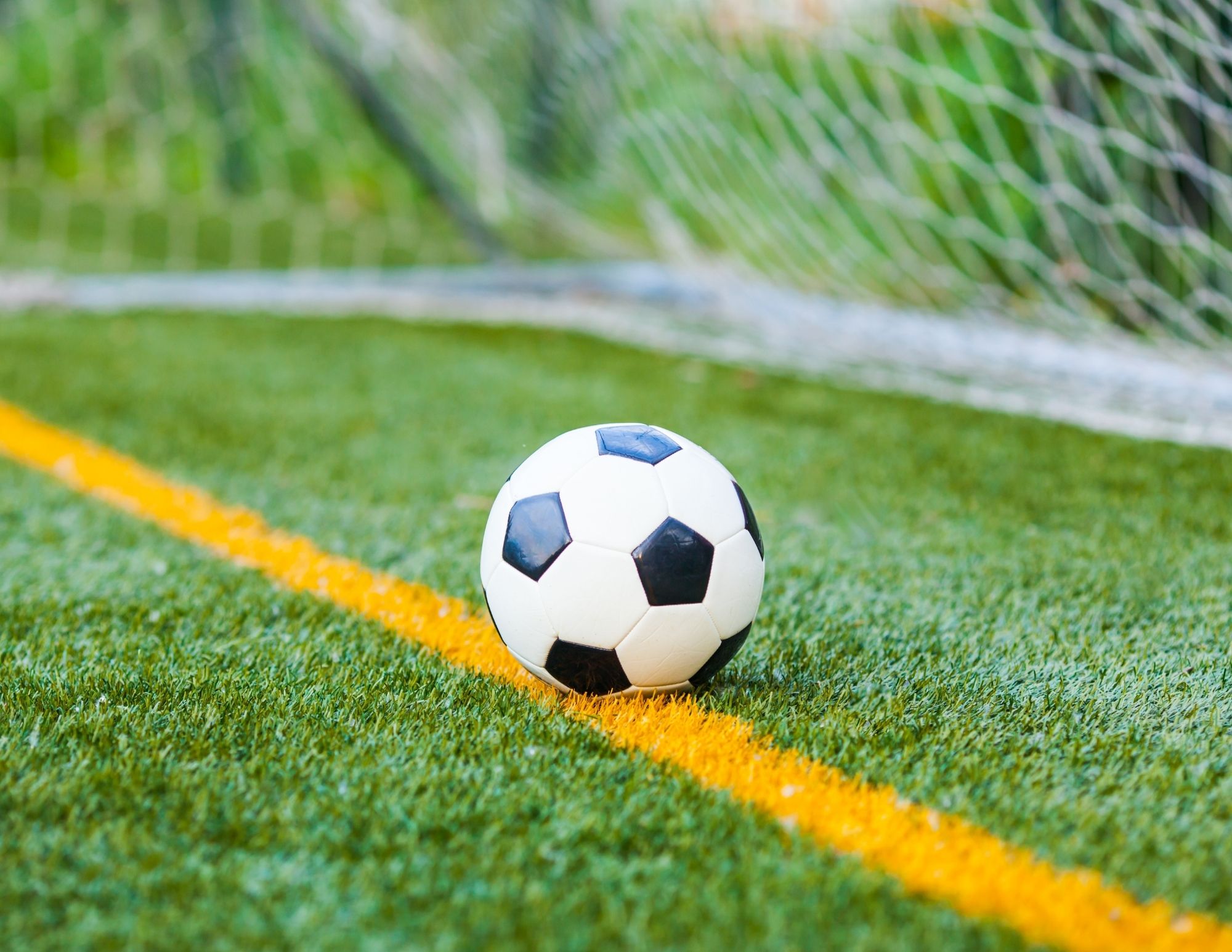 Close Up of a Blue and White Soccer Ball Next To a White Line on a