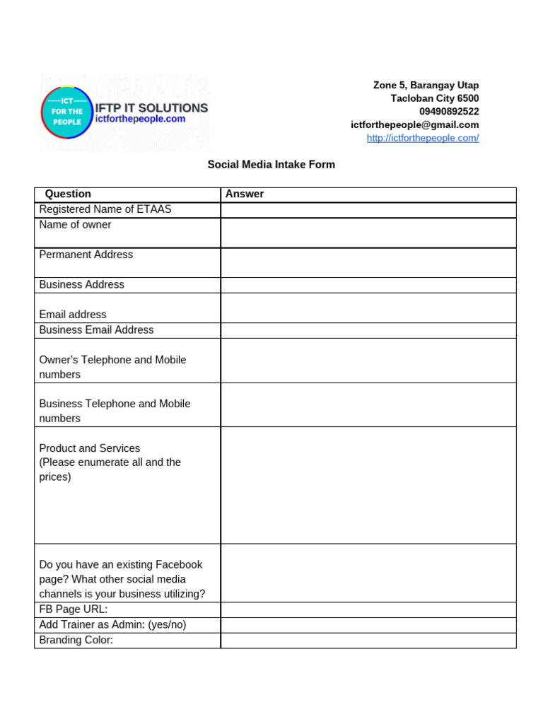 Social Media Intake Form Template