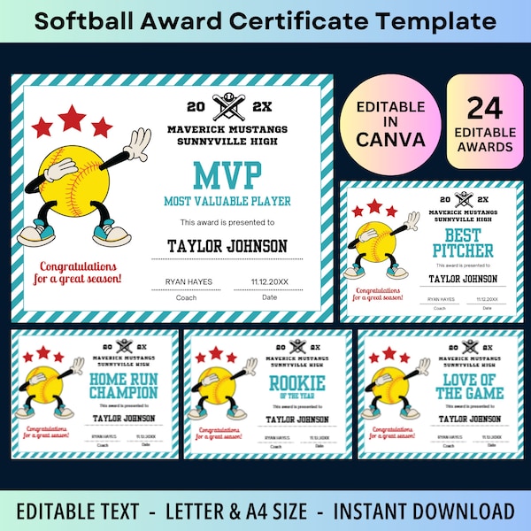 Softball Awards Printable Softball Team Certificate Bundle Editable
