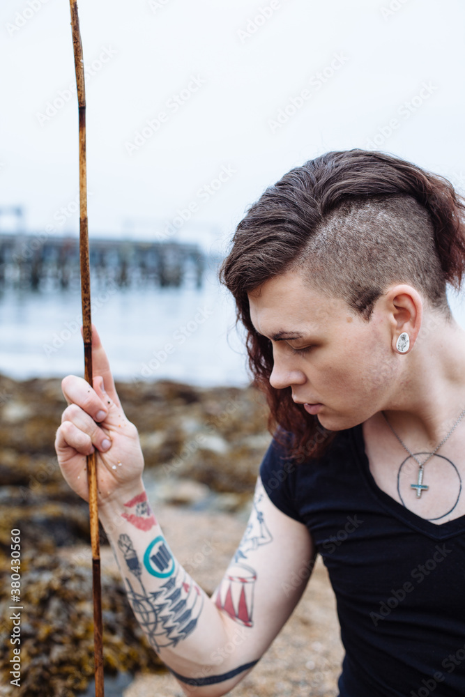 Foto de Transgender gender fluid person with tattoos sitting on beach