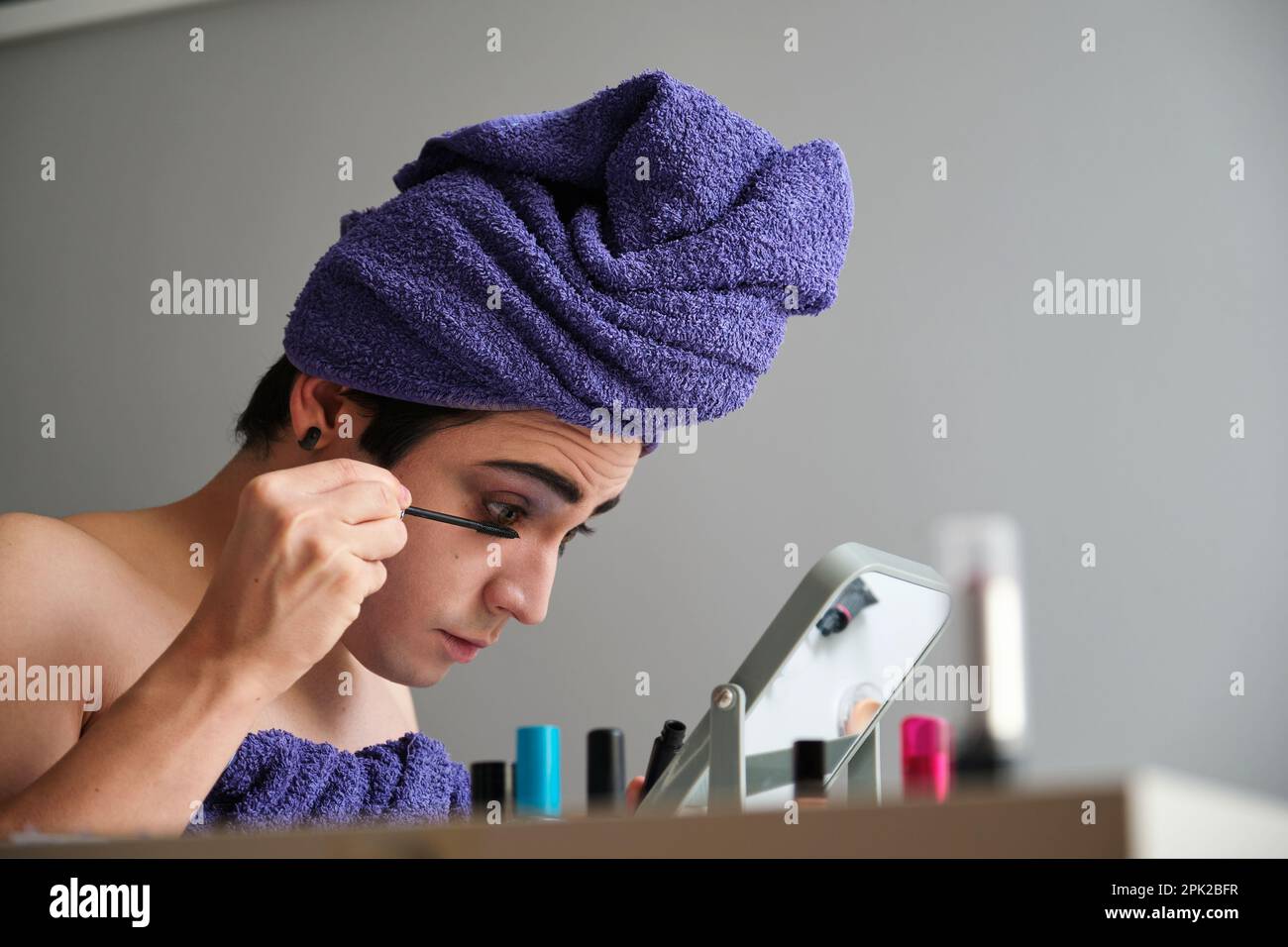 Young gender fluid person applying eye mascara Stock Photo Alamy