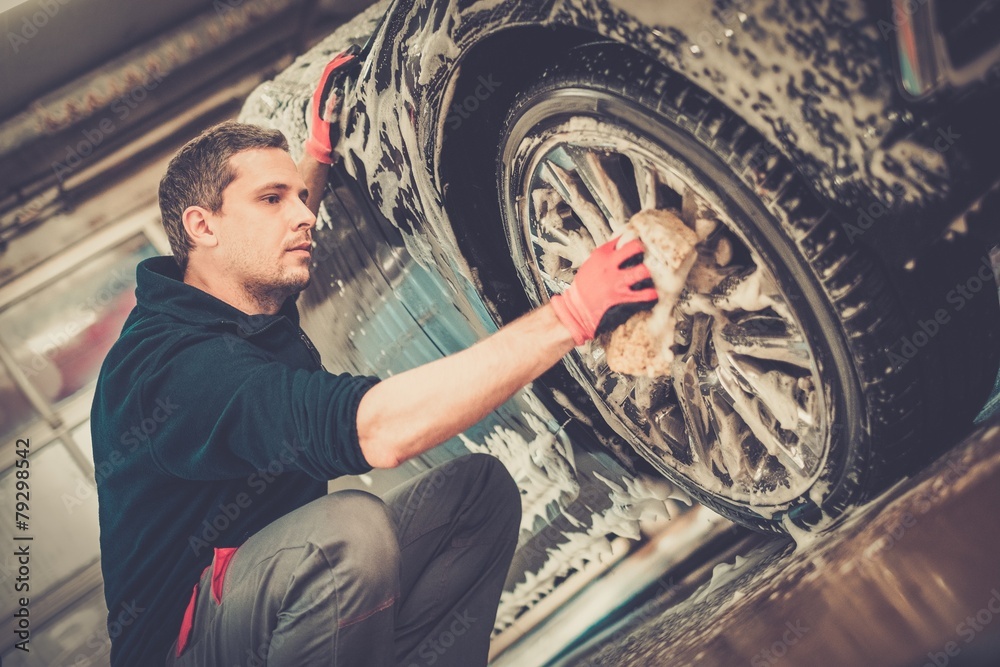 Man worker washing car s alloy wheels on a car wash Stock Foto Adobe