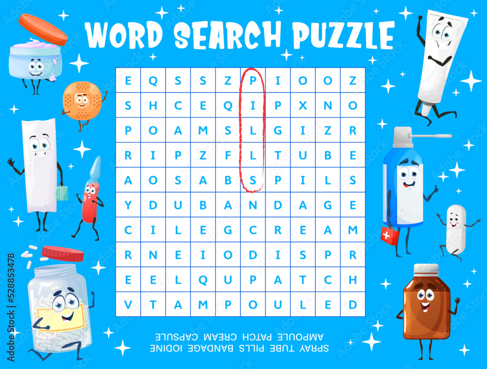 Cartoon Medical Instruments Pills Ointment Word Search Puzzle Game