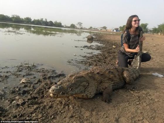Tourist crouches down on the back of a wild CROCODILE to pose for the