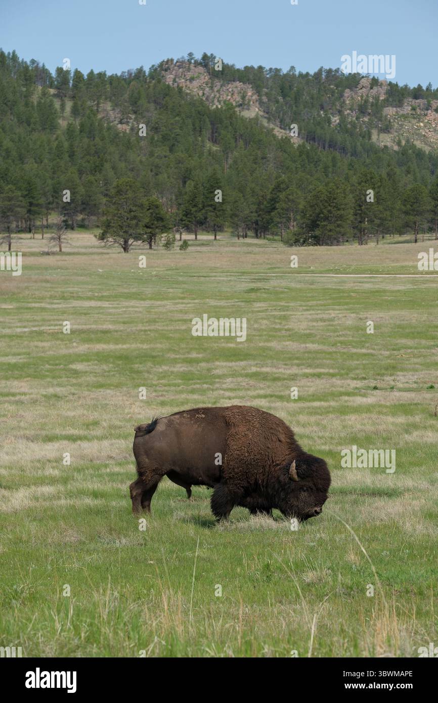 A lone American bison stands on a tallgrass prairie in South Dakota