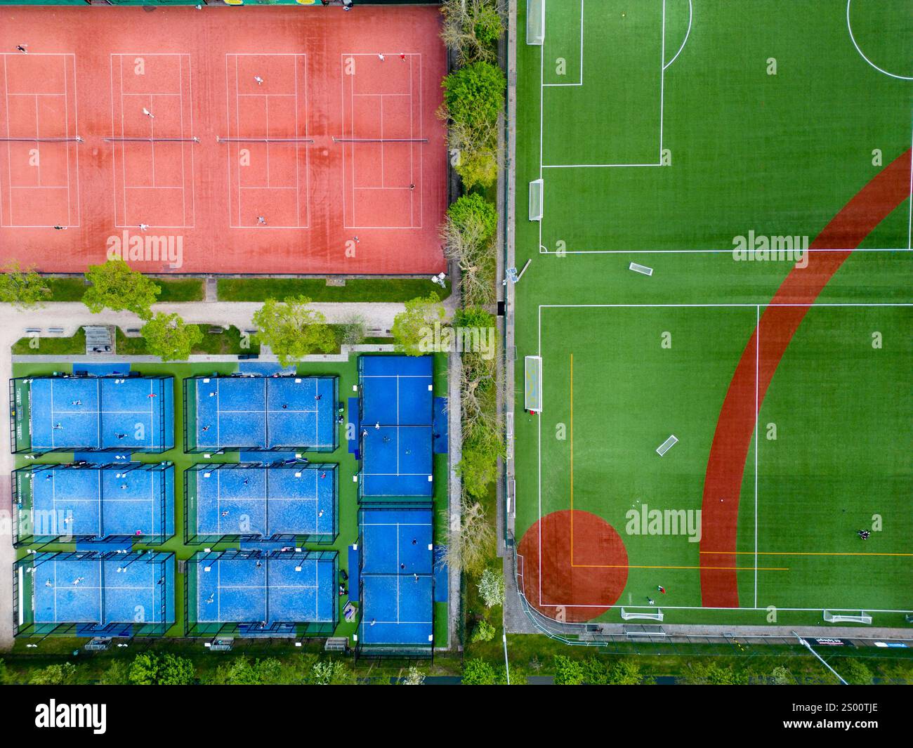 Aerial view of orange tennis courts and blue colored padel courts Stock