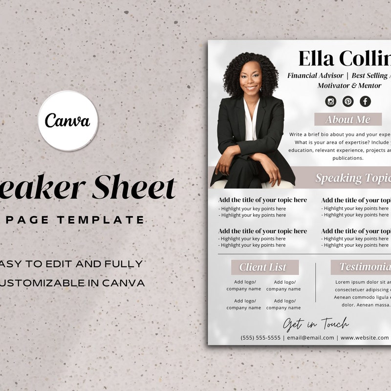 Speaker One Sheet Speaker Sheet Template Canva Keynote Etsy