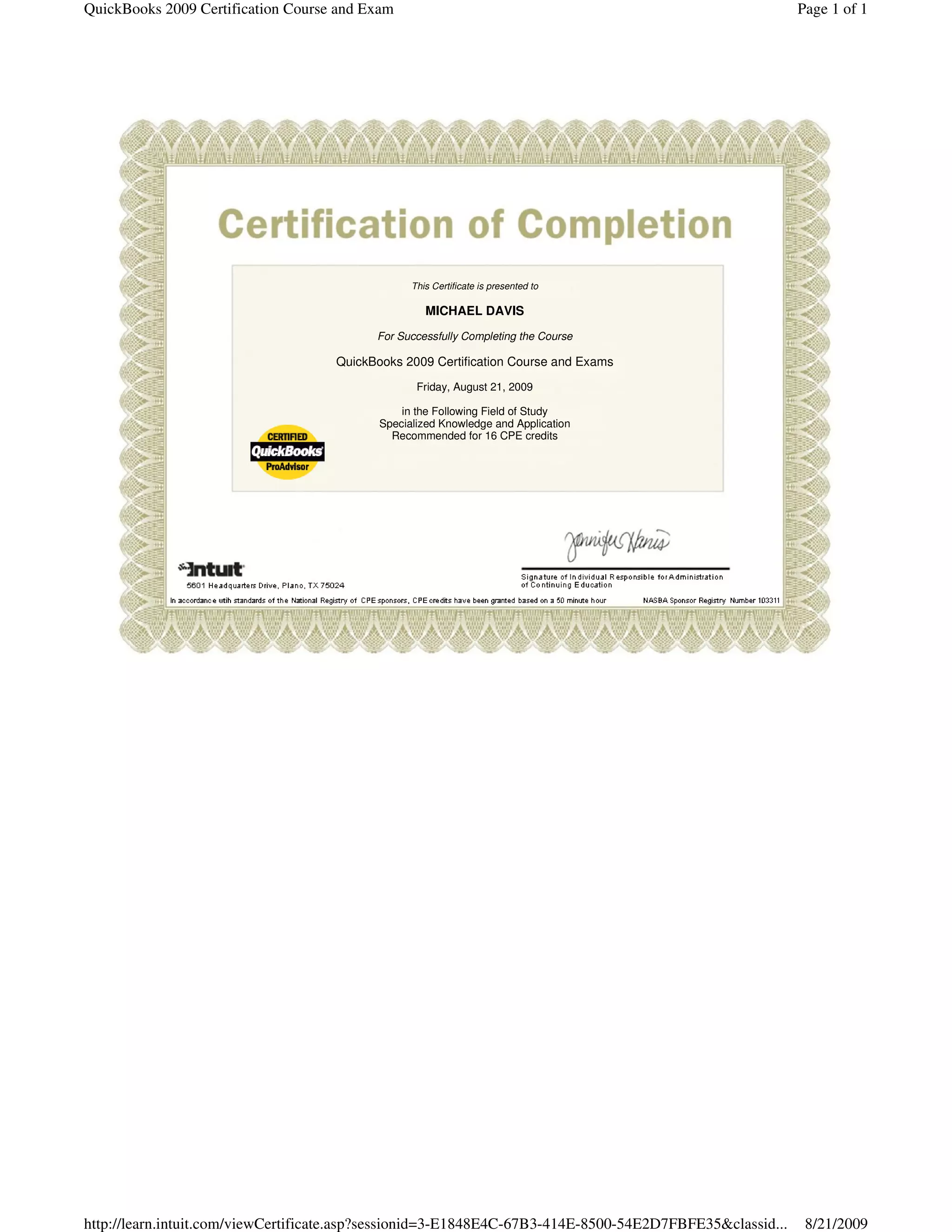 Quick Books Pro Advisor Certificate 2009 PDF