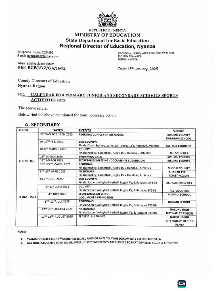 Primary and Secondary Sports Calender PDF