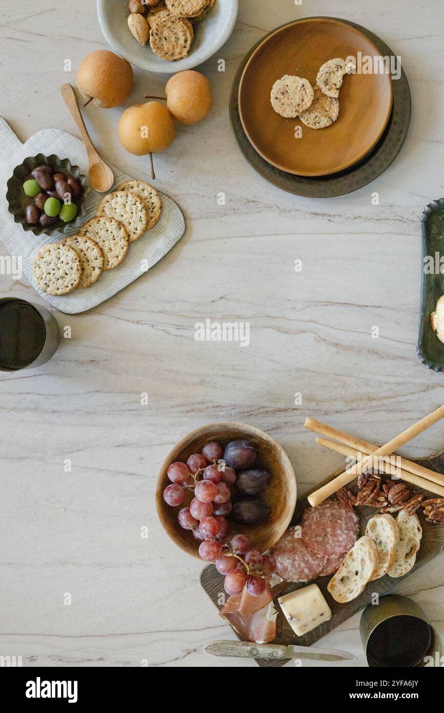 Charcuterie spread with fruit nuts cheese and crackers on a table