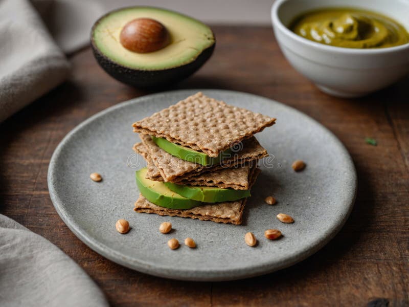 Buckwheat Crackers Spread with Hummus and Sliced Avocado for a