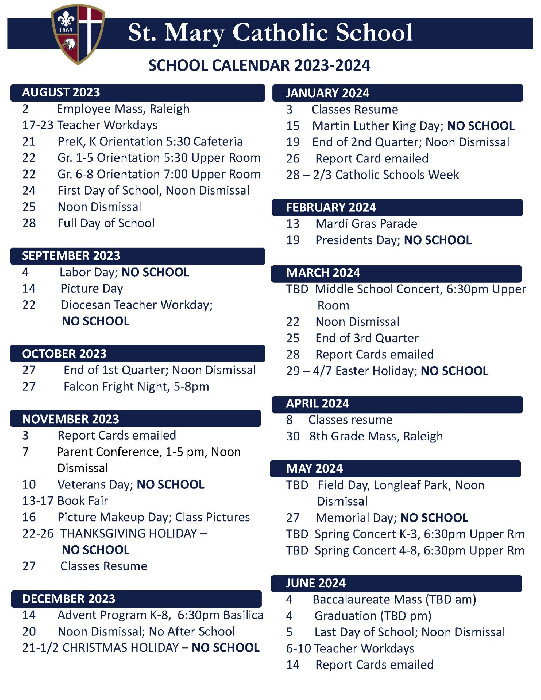 Calendar Saint Mary School