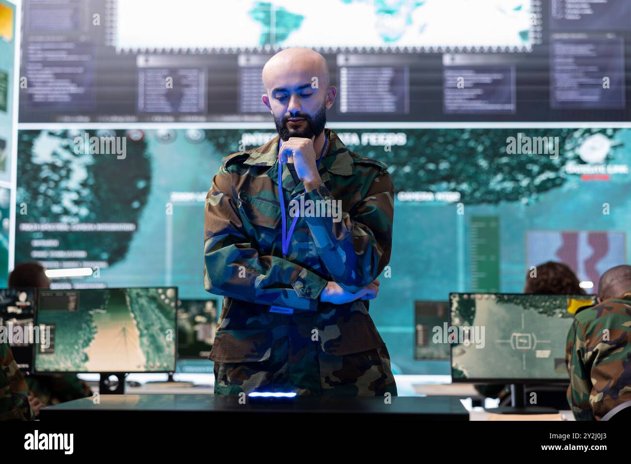 Military staff examining a projection on hologram in command center