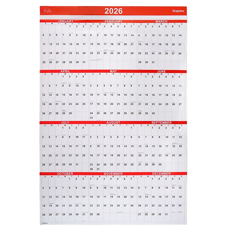2026 Staples 24 quot x 36 quot Yearly Dry Erase Wall Calendar White/Red