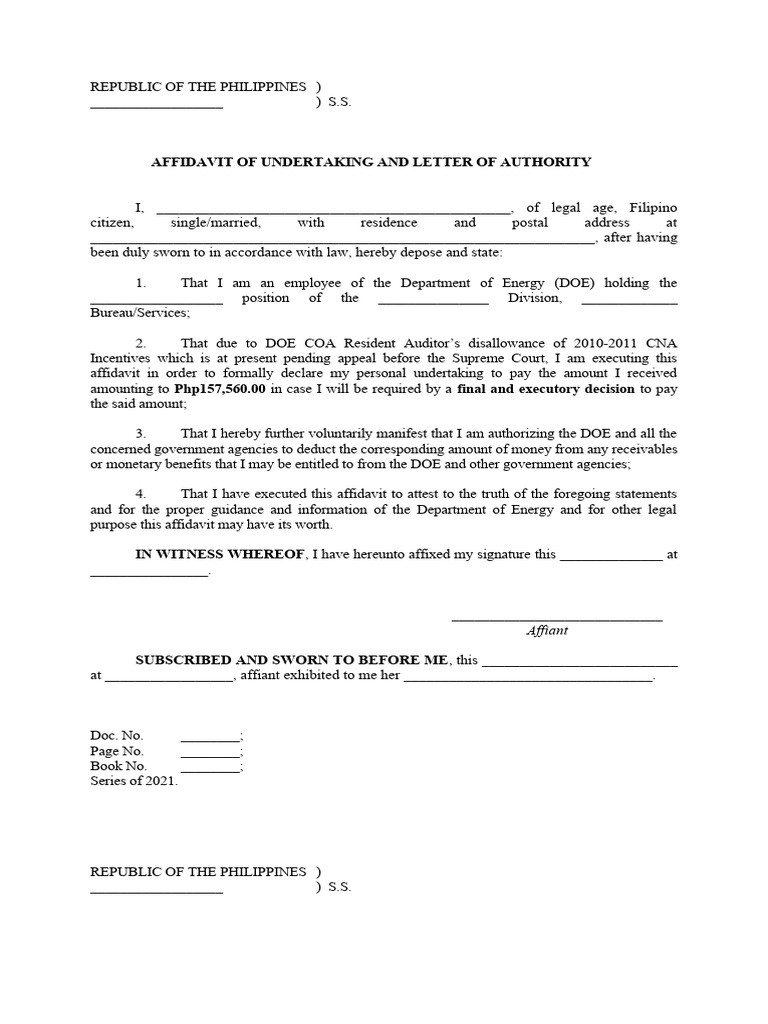 Template Affidavit of Undertaking PDF