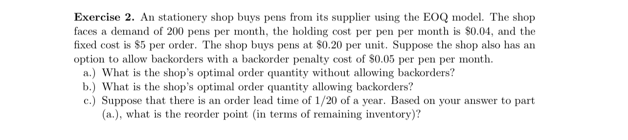 Solved Exercise 2 An stationery shop buys pens from its Chegg com