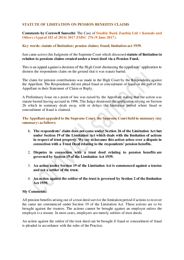 (PDF) PENSION BENEFIT CLAIMS IN ZAMBIA AND THE STATUTE OF LIMITATIONS
