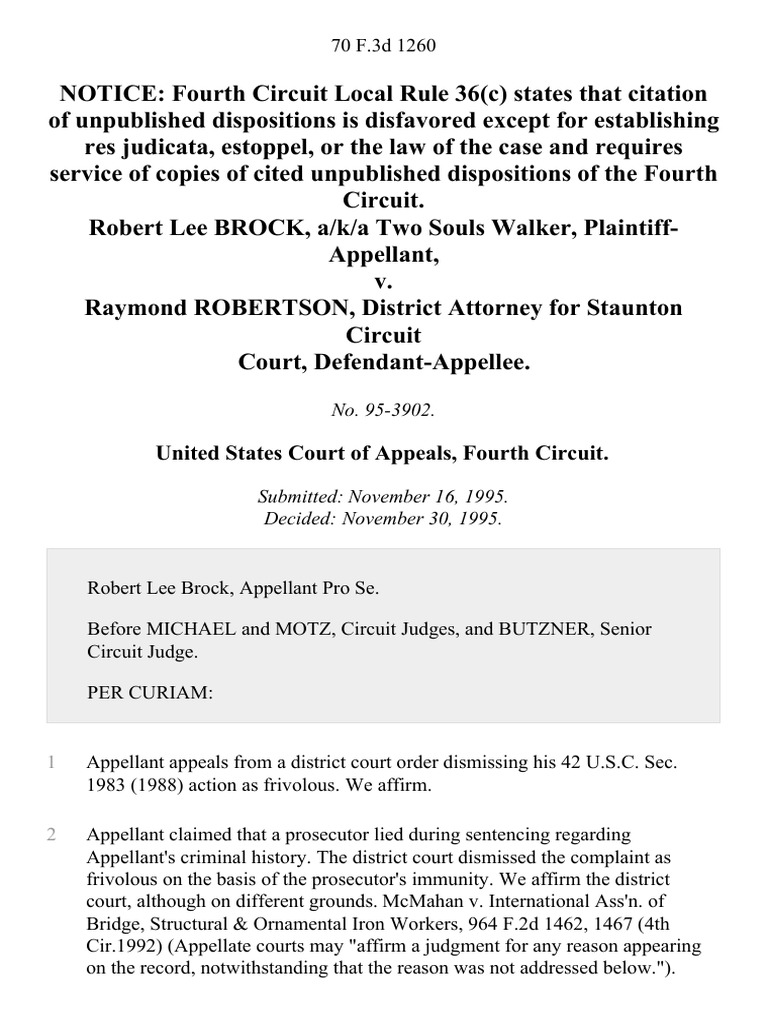 Robert Lee Brock A/K/A Two Souls Walker v Raymond Robertson District