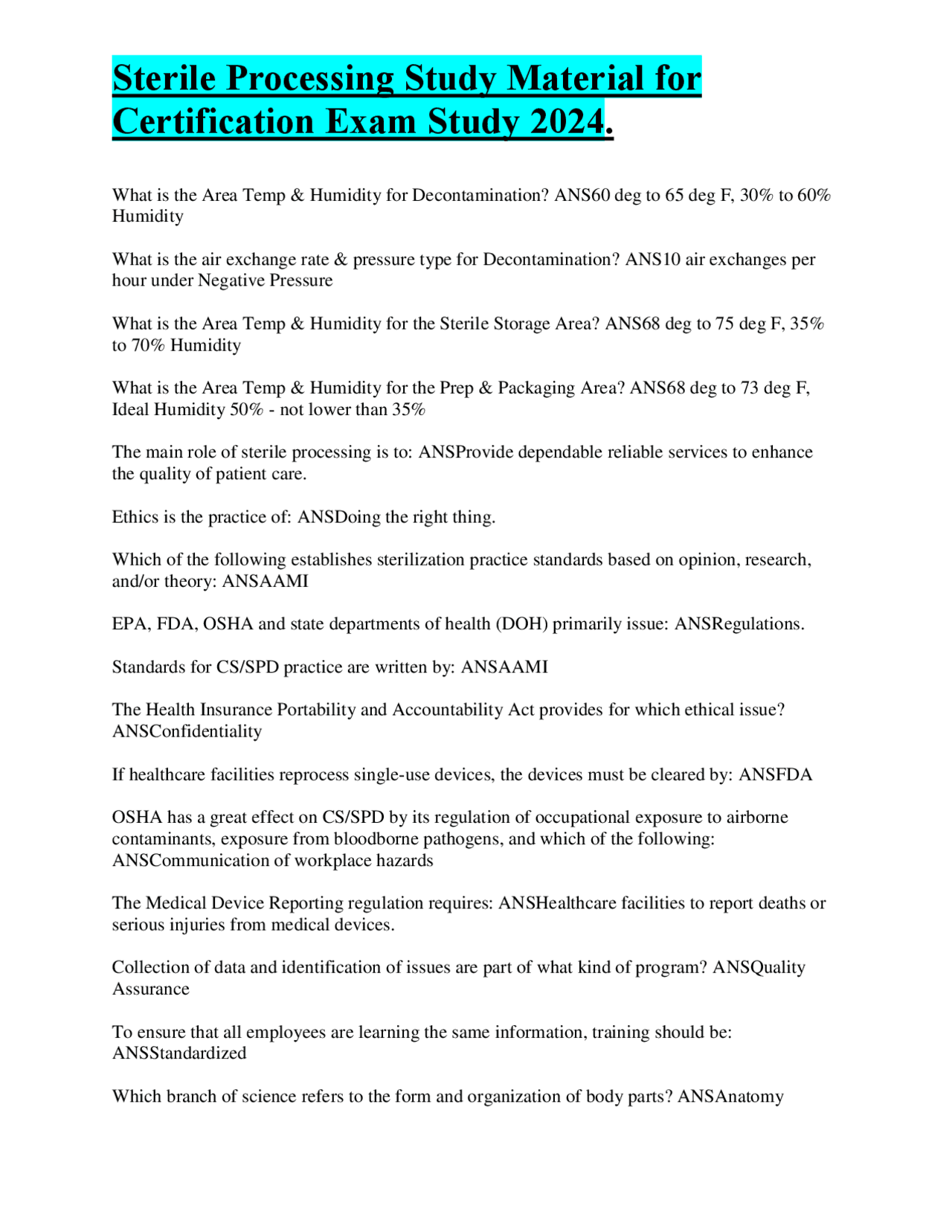 CBSPD Sterilization Certification Exam Review Questions and Answers