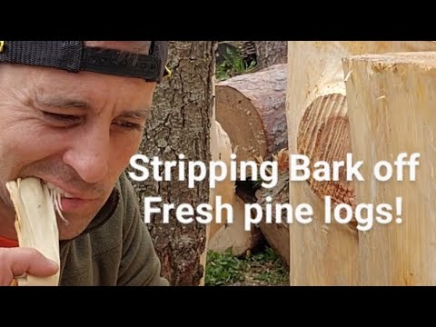 Strip off bark from fresh cut logs with trick on removing sticky Pine
