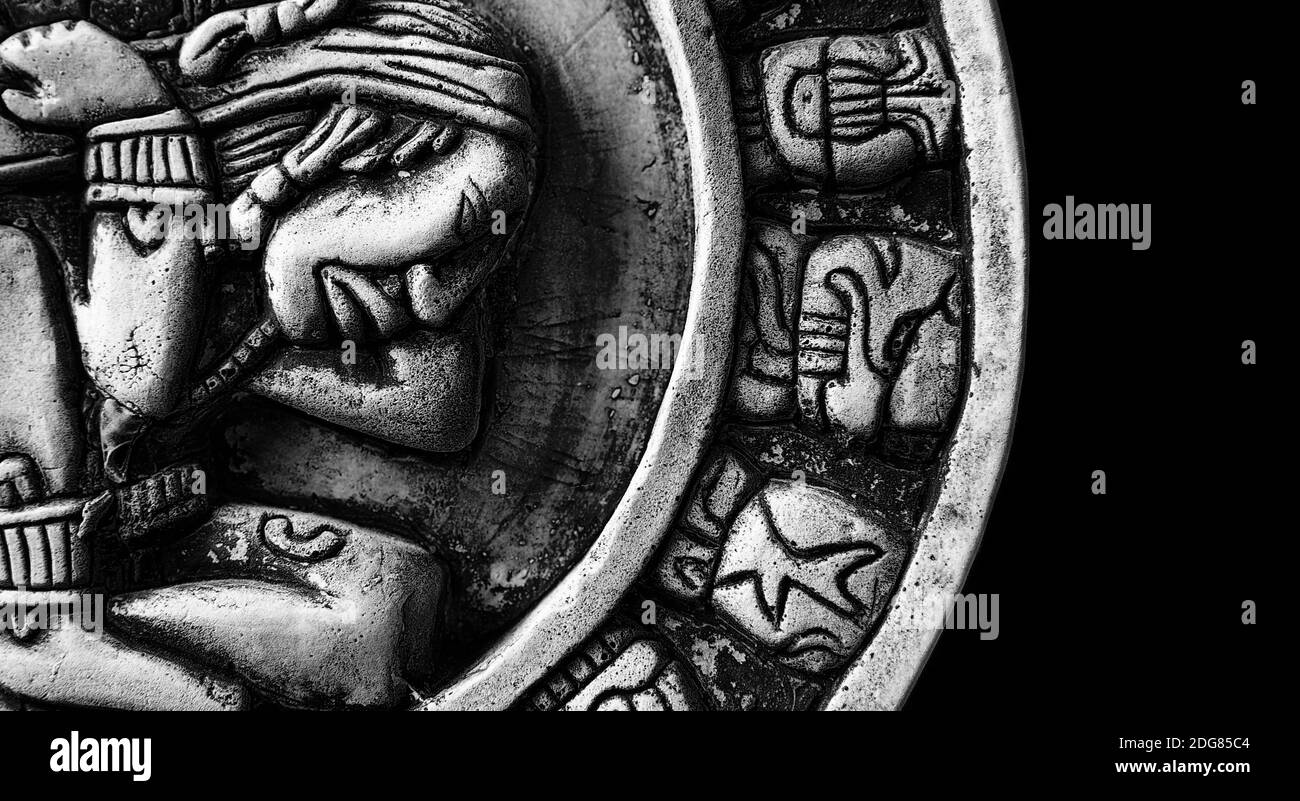 Close view of the ancient Aztec mayan calendar with round pattern and