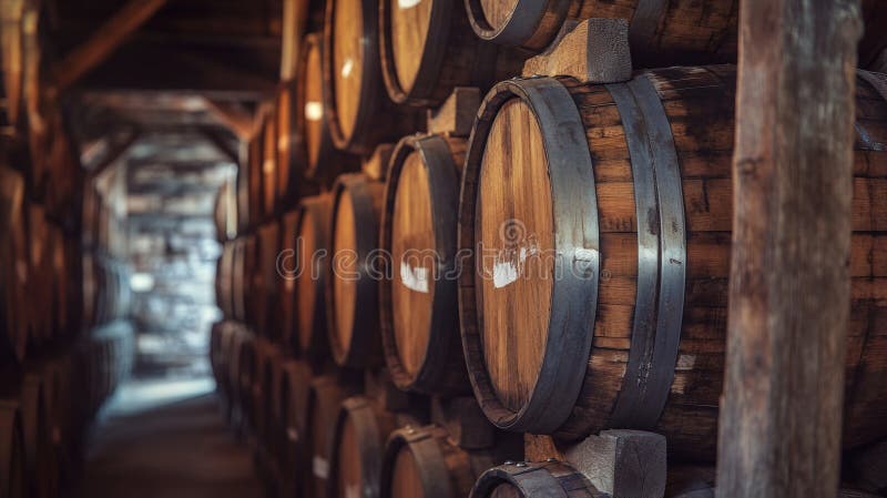 Wooden Barrels Stacked High Often Used in Storage or Decoration Stock