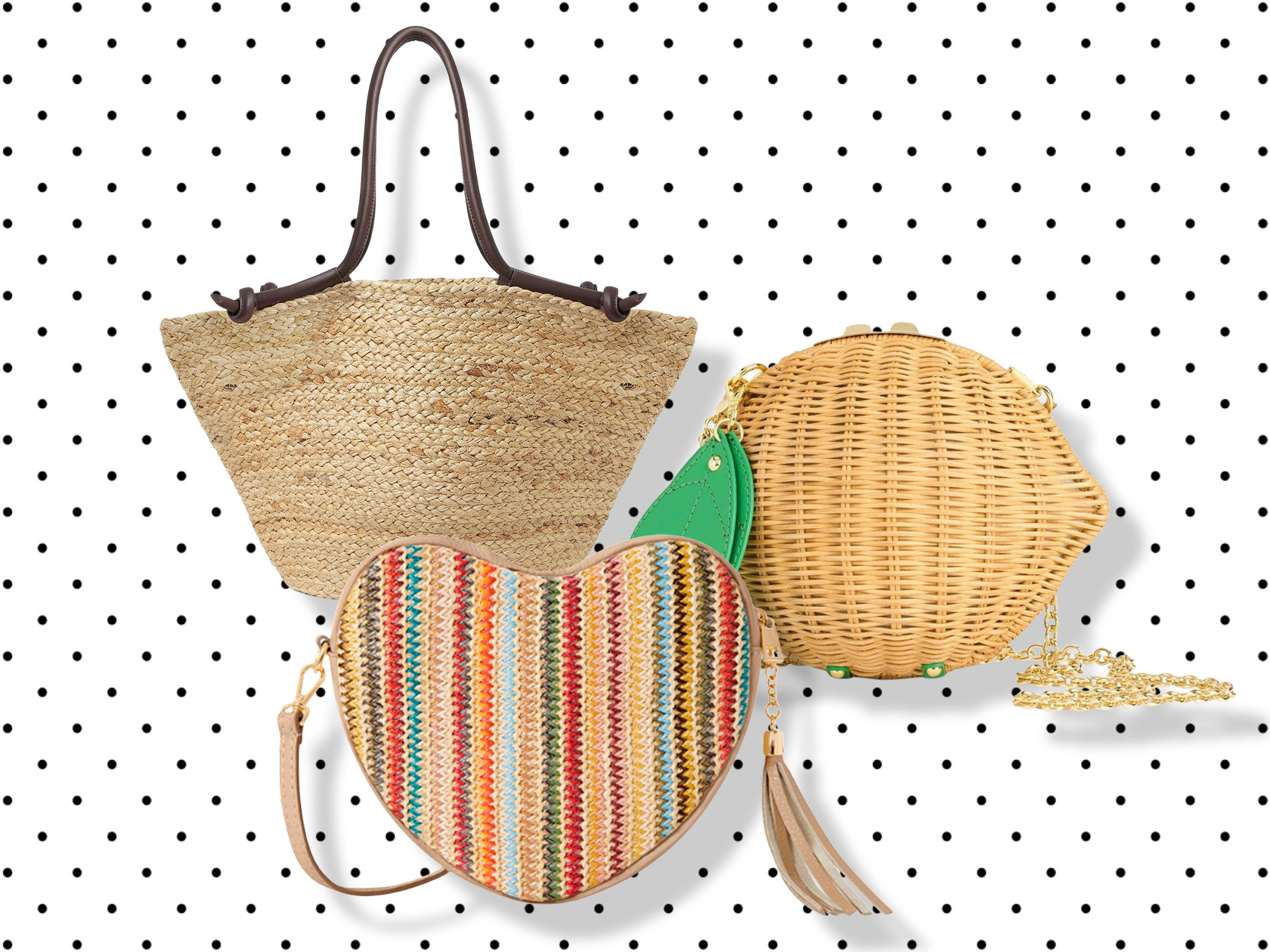 8 straw and raffia bags shaped like fish fruit and more