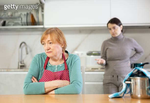 Elderly sad woman stands in kitchen and listens to insults Concept