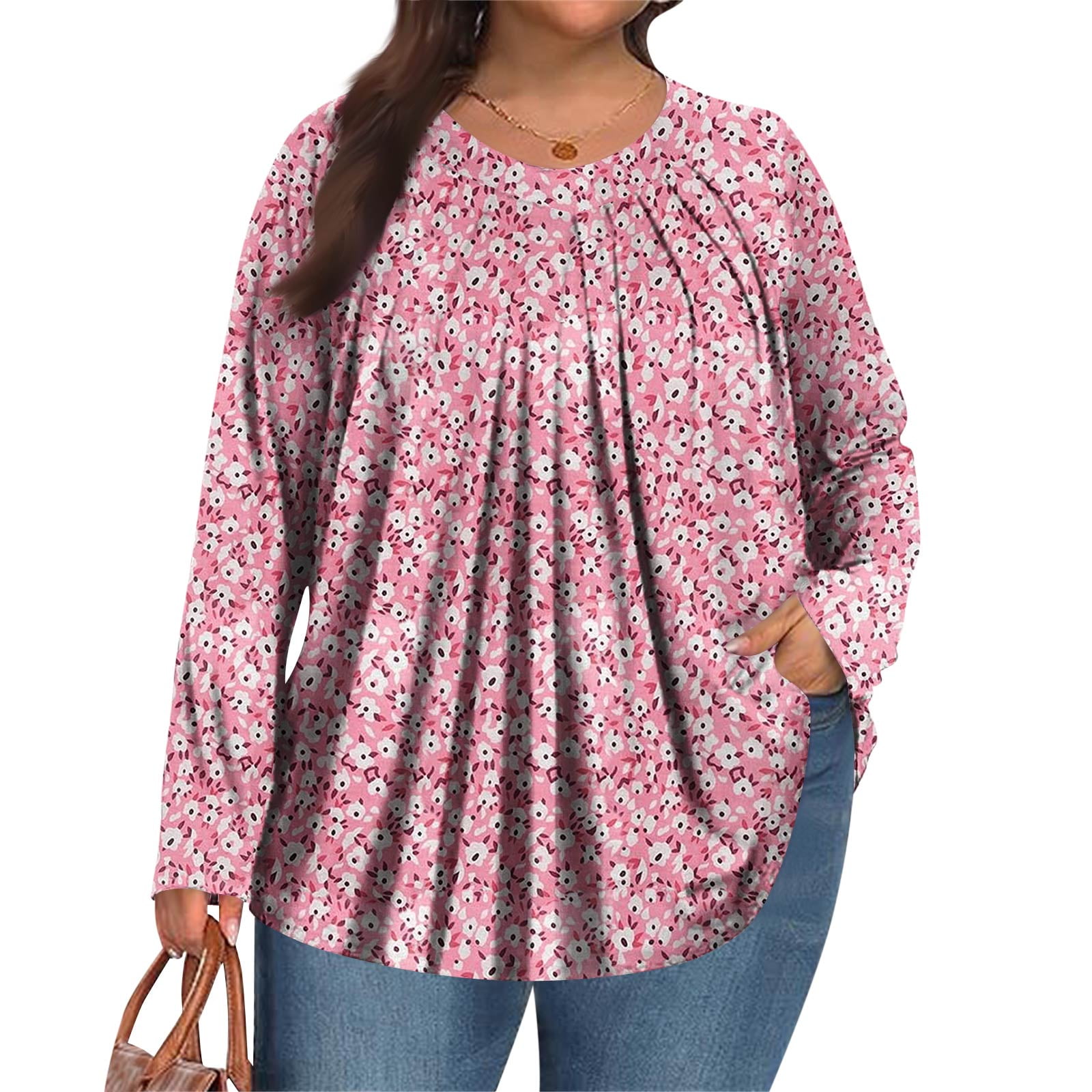 ASDFVBKG Womens Plus Size Tops Pleated Round Neck Long Sleeve Tops