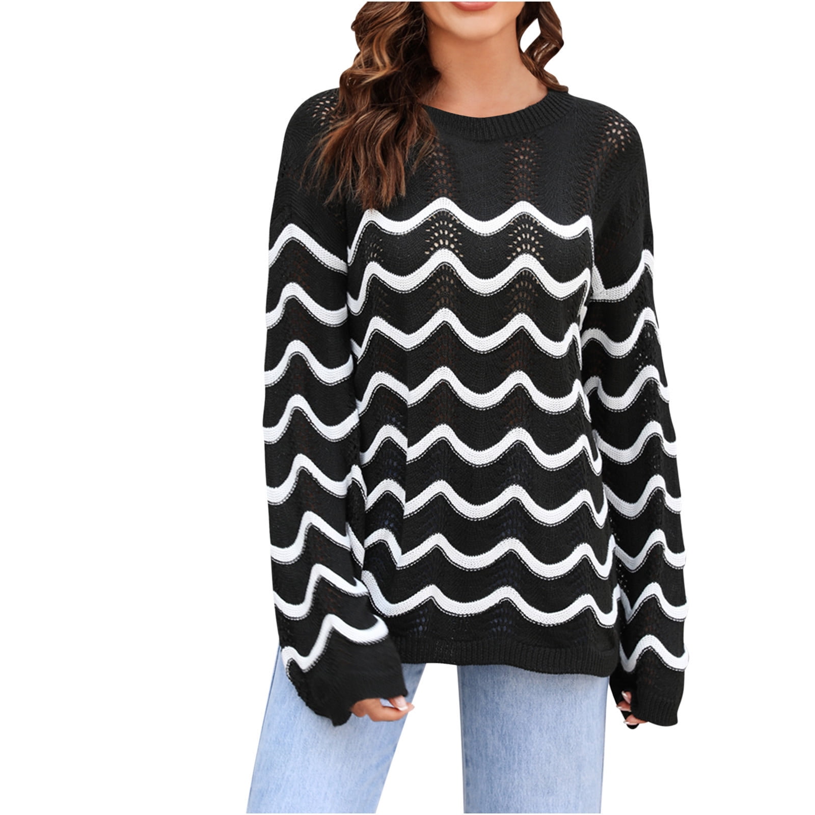 Elvqul Womens Pullover Sweaters Striped Oversized Black Knit Long