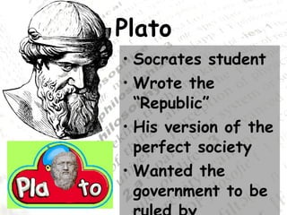 Plato Student of Socrates wrote The Republic and The Symposium