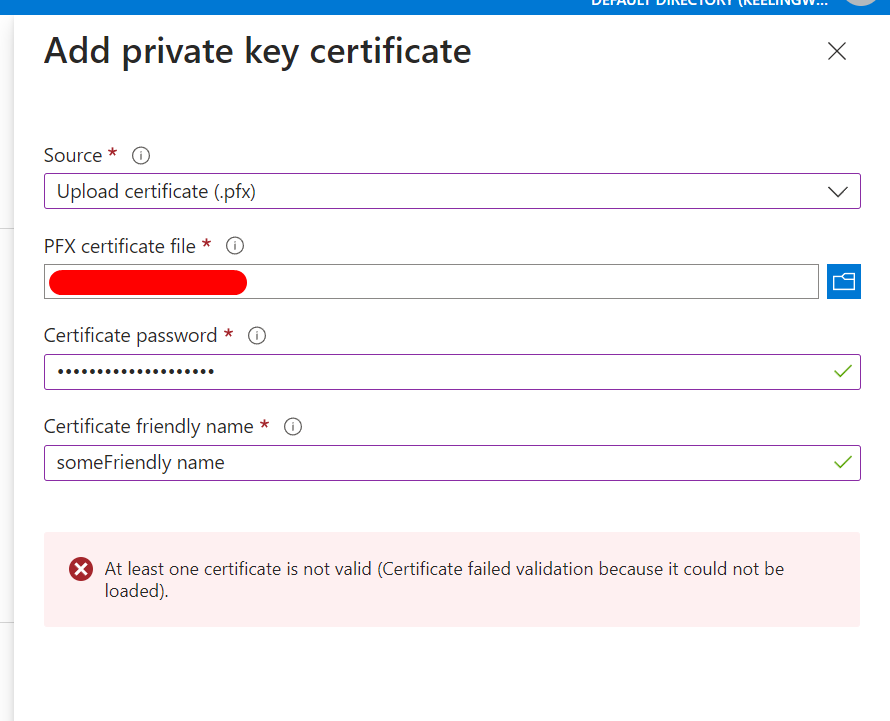 ssl Azure App Service unable to validate pfx file: Certificate