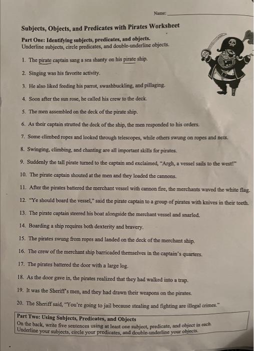 Identifying Subjects Predicates and Objects: Pirates Worksheet