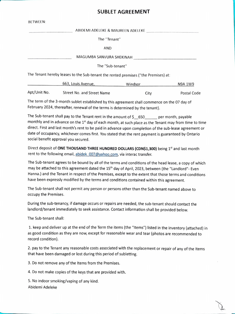Sublet Agreement Ontario Template