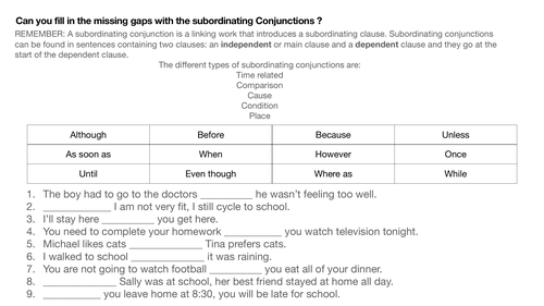 Subordinating Conjunctions Worksheet online exercise for Live Worksheets