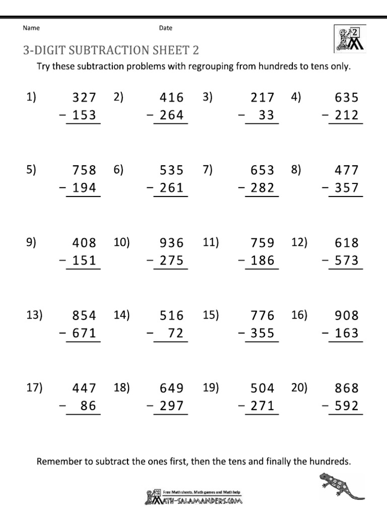 3 Digit Subtraction Worksheets