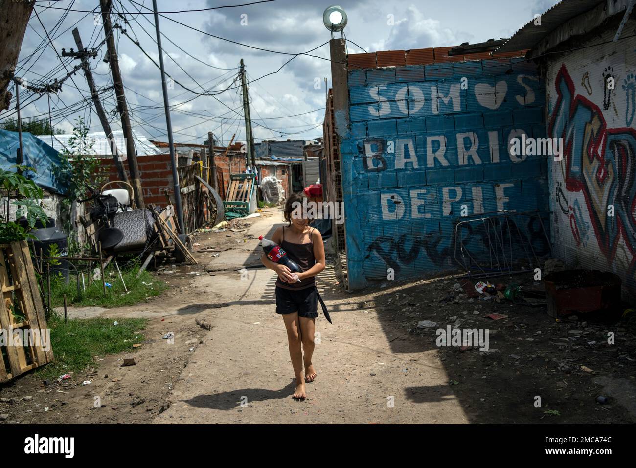 A girl carries a soft drink bottle through the Puerta 8 suburb north of